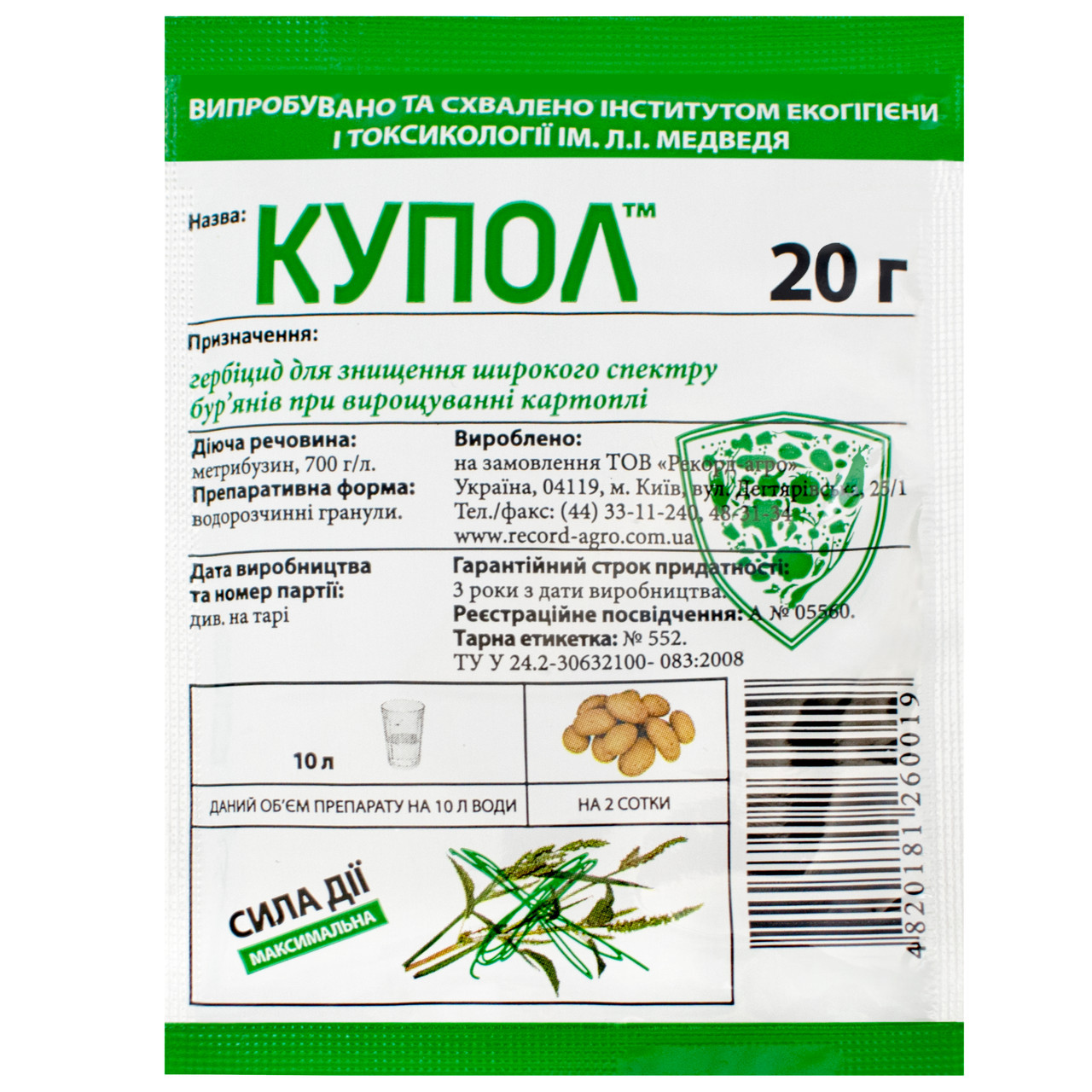 Показати оптові ціниДовсходовий гербіцид Купол використовується для захисту картоплі на ґрунтах різних типів від широкого спектру однорічних і багаторічних бур'янів. Активний компонент препарату — метрибузин (metribuzin) має системну дію. Речовина метрибузин, проникаючи в надземну та кореневу частини бур'яну, перешкоджає синтезу фітогормонів, порушує процеси фотосинтезу та поглинання вуглекислого газу, що призводить до загибелі рослин. Засіб має тривалий період захисної дії (6-8 тижнів), який залежить від температури, типу та вологості ґрунту. Щоб застосування препарату було максимально ефективним, важливо не порушувати утворену на поверхні ґрунту плівку міжрядними обробками. Гербіцид Купол ефективний у посівах картоплі, захищаючи овочеву культуру від лободи (види), щириці, ромашки непахучої, редьки дикої, гірчаку (види), зірочника середнього, мишія, курячого проса, осоту городнього.