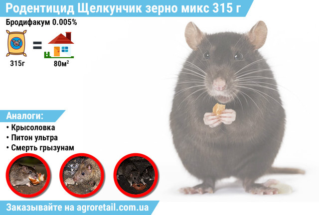 Показати оптові ціниЗерно Лускунчик - готовий до застосування родентицид з ароматом арахісу та сиру, який використовується для повного винищення щурів та мишей на присадибних ділянках, сільськогосподарських угіддях та в закритих приміщеннях. Принада Щелкунчик містить у складі діючу речовину – бродіфакум. Потрапляючи в організм тварини, цей синтетичний антикоагулянт крові порушує утворення вітаміну K1, необхідного для розвитку білків протромбінового комплексу. Через одну добу після споживання препарату у гризуна різко знижується рівень згортання крові. Внаслідок цього будь-яке внутрішнє або зовнішнє пошкодження гризуна призводить до внутрішньої кровотечі та його загибелі. Загибель гризунів настає протягом 3-7 днів після поїдання протравленої принади. Через відстрочену дію принади, у гризунів немає підозри, що смерть сородичів пов'язана з принадою. Родентицид містить муміфікатор, що не дозволяє загиблим гризунам розкладатися та поширювати згубний запах.